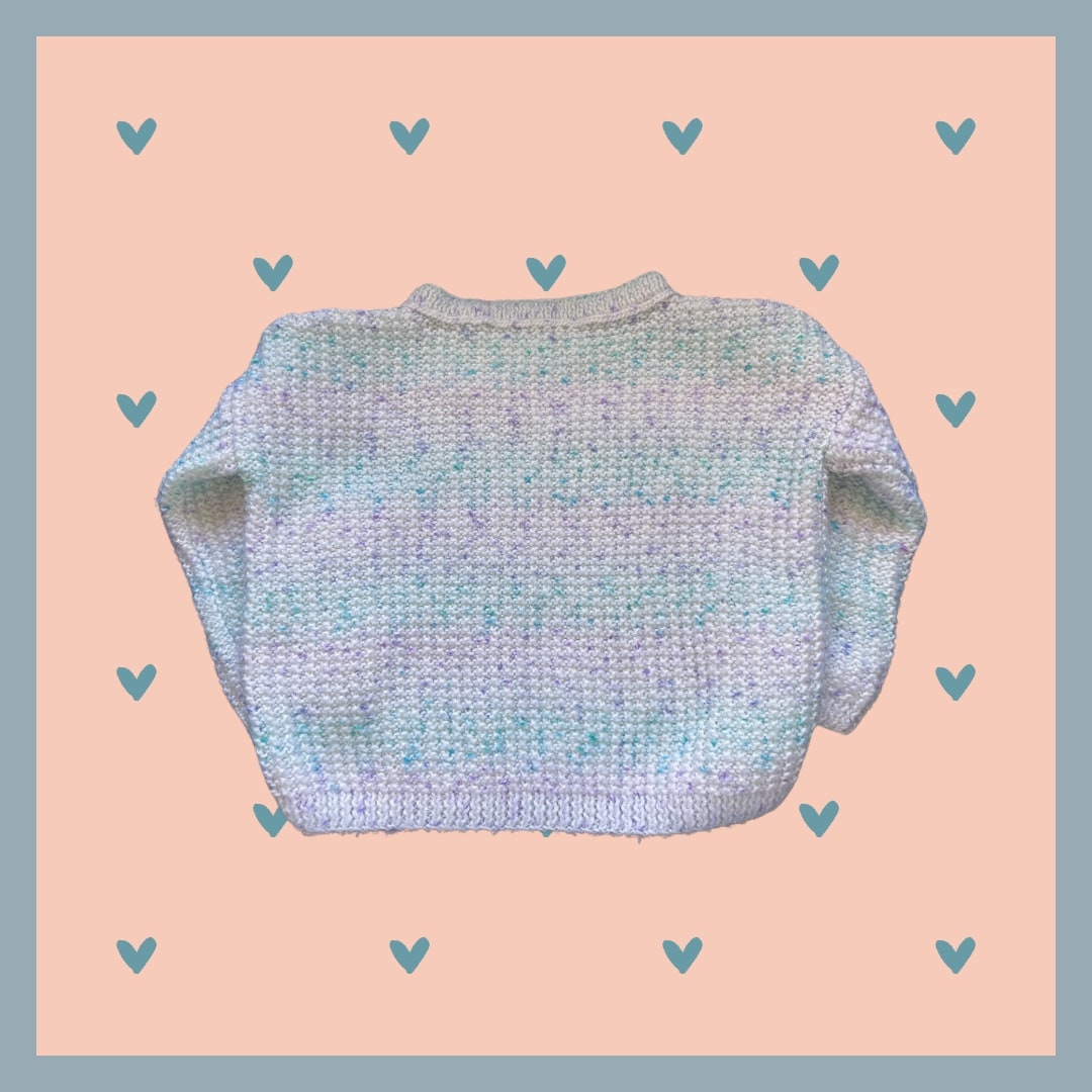 Handmade long-sleeve sweater in 100% organic wool. White base with a gradient effect featuring soft shades of blue and violet. Soft, warm, and comfortable for delicate skin. Suitable for both girls and boys.